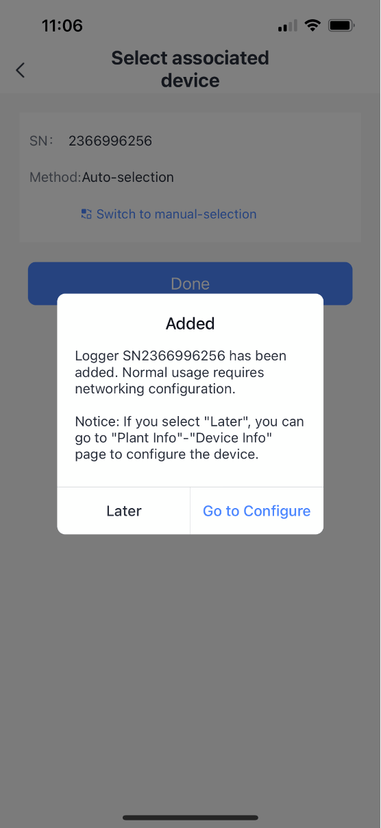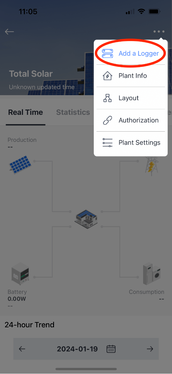 Using an iPhone or an iPad, in the Solarman app, select your plant and click the 3 dots in the top right corner. Click on Add a Logger.