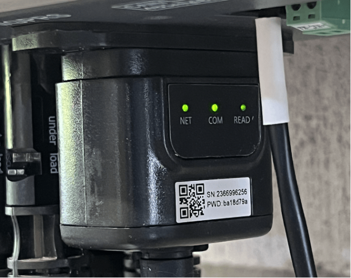 Once the inverter and logger have been unpaired, you will need to pair your new modem. Locate the Wifi dongle at the bottom of your inverter. It should have 3 lights, a QR code, a serial number, and a password. It looks like this: