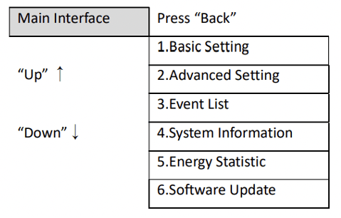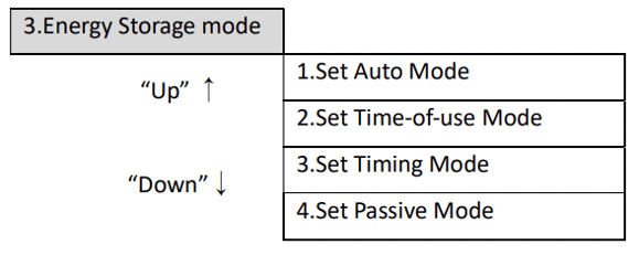 Select “3. Energy Storage Mode”, press the ENTER arrow to enter energy storage mode setting interface.