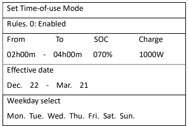 You can also select effective dates for Time of Use mode too. Outside the effective date, your HYD-ES inverter is working in Auto Mode. You can set multiple Time of Use rules to meet your more complex requirement. Your inverter supports 4 rules currently (rule 0/1/2/3).